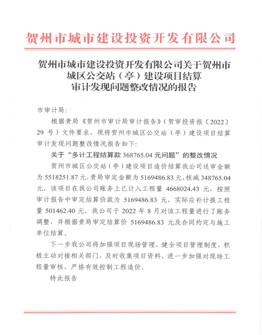 下一篇:關(guān)于賀州市城投公司辦公樓附屬裝修工程結算審計發(fā)現問(wèn)題整改情況的報告